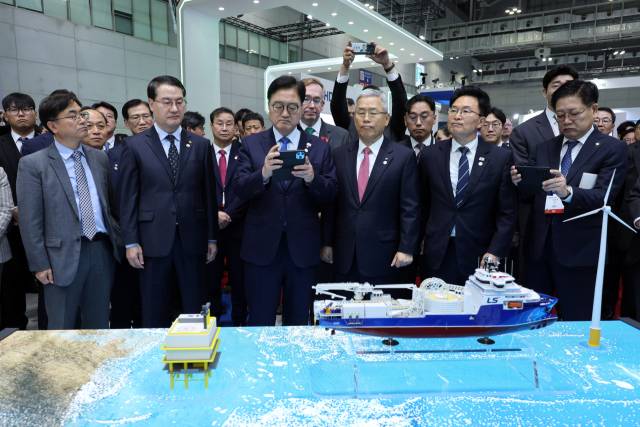 우원식(앞줄 왼쪽 세 번째) 국회의장과 김동철(〃 네 번째) 한국전력공사 사장이 5일 광주 서구 김대중컨벤션센터에서 열린 ‘빛가람 국제 전력기술 엑스포(BIXPO) 2025’에 참석해 LS그룹의 차세대 전력 솔루션을 살펴보고 있다. ‘에너지로 연결하다’를 주제로 열린 이번 행사에는 전력 소모를 줄이는 인공지능(AI) 반도체, 암모니아·수소엔진을 이용한 무탄소 분산 에너지 발전 사업, 선박용 수소연료전지 시스템 등이 신기술로 소개됐다. 연합뉴스
