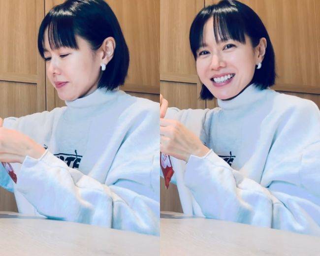 영상 속 손예진은 회색 맨투맨과 화이트 폴라티를 겹쳐 입은 편안한 차림으로, 차분하게 무언가를 뜯으며 미소 짓는 모습을 보였다.