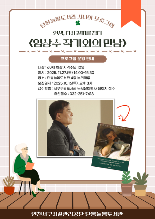 인천 서구에 있는 단봉늘봄도서관은 오는 27일 ‘임상수 작가와의 만남’을 진행한다. 30여년 간 연합뉴스 기자로 활동한 임 작가는 은퇴의 경험을 담은 ‘잠 못 드는 오십, 프로이트를 만나다’를 펴냈다. 이날 작가와의 만남은 60세 이상을 대상으로 한다.