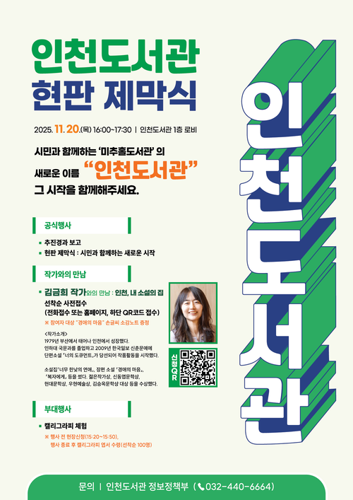 인천도서관은 지난 9월29일 미추홀도서관에서 명칭이 변경됐다. 이날 행사는 명칭 변경을 기념하는 현판 제막식과 함께 진행된다. 도서관은 작가와의 만남 참여자를 선착순으로 접수하고 있다.