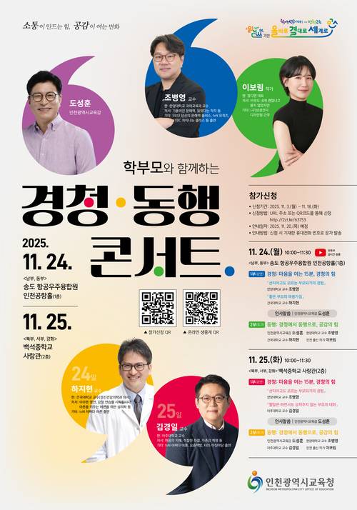 인천시교육청은 오는 24~25일 ‘경청·동행 콘서트’를 연다. 24일은 연수구 항공우주융합원에서 진행되며 중·동·미추홀·남동·연수구·옹진 지역 학부모 등이 참여하면 된다. 25일은 백석중학교에서 열리며, 서·부평·계양·강화 지역에서 참여할 수 있다. 프로그램 내용은 같다.