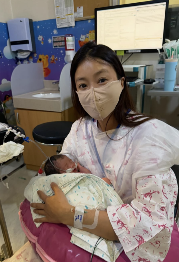 사진 속 그는 출산 후에도 부기 없는 모습으로 마스크를 끼고 신생아를 품에 안고 미소 짓고 있다.