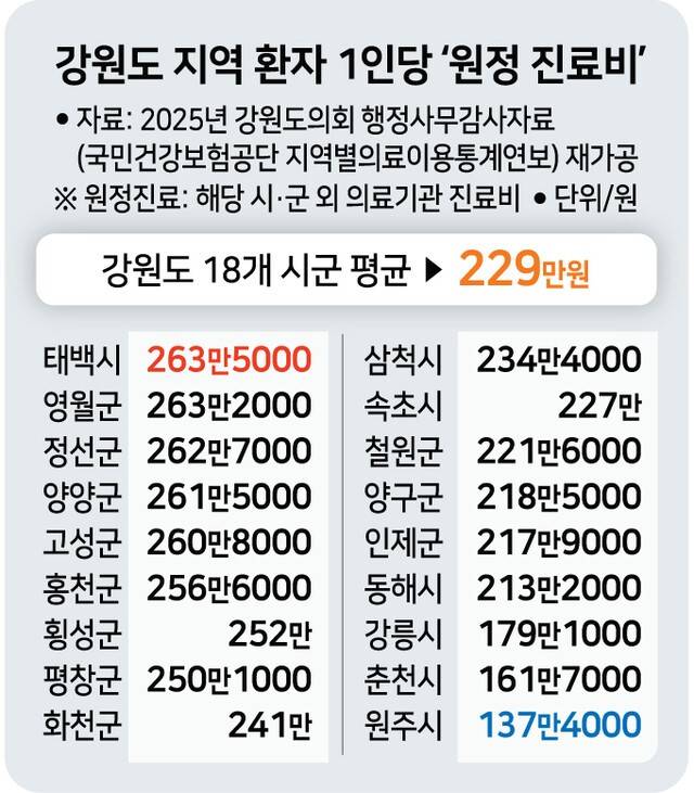 1인당 평균 원정 진료비가 가장 높은 태백 지역 주민들은 18개 시·군 평균(229만원)보다 34만5000원을 더 지출하고 있었다. 평균 진료비가 가장 낮은 원주보다는 지출액이 무려 126만1000원 더 많았다.