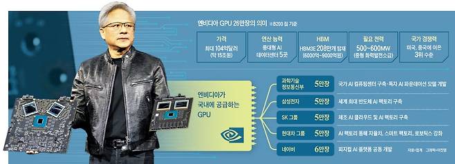 엔비디아가 한국 정부와 기업에 고성능 그래픽처리장치(GPU) 26만장을 공급하기로 하면서 ‘인공지능(AI) 동맹’을 구축했다. 정부와 삼성·SK·현대차는 각 5만장, 네이버는 6만장을 확보하게 됐다. 현재 국내에 있는 고성능 GPU 4만5000장의 5배 이상이 2030년까지 우선 공급되는 것으로, 인프라 부족에 허덕이던 국내 AI 생태계에 큰 보탬이 될 전망이다.