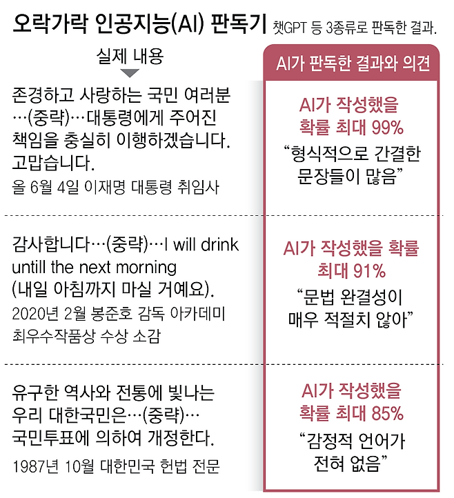 생성형 AI가 도입되거나 보급되기 전의 말과 글도 예외가 아니었다. 1987년 10월 제정된 대한민국 헌법 전문의 경우 AI가 작성했을 확률이 최대 85%라고 나왔다. “감정적 언어가 전혀 없다”는 이유였다. 2020년 2월 봉준호 감독이 영화 ‘기생충’으로 아카데미 최우수작품상을 받고 밝힌 소감의 경우 AI가 작성했을 확률이 최대 91%로 평가됐다.