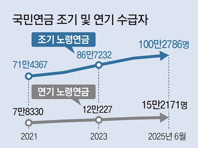 생활비 부족 등 때문에 국민연금을 미리 받는 조기 노령연금 수급자가 올해 100만 명을 넘었다. 조기 퇴직자가 증가하고 연금 수급 개시 연령이 65세까지 점차 높아지는 게 원인으로 꼽힌다. 최근엔 고액 수급자도 건강을 걱정하거나 일찍 받아 쓰는 게 낫다고 판단하면서 조기 수급이 늘어나는 추세다.