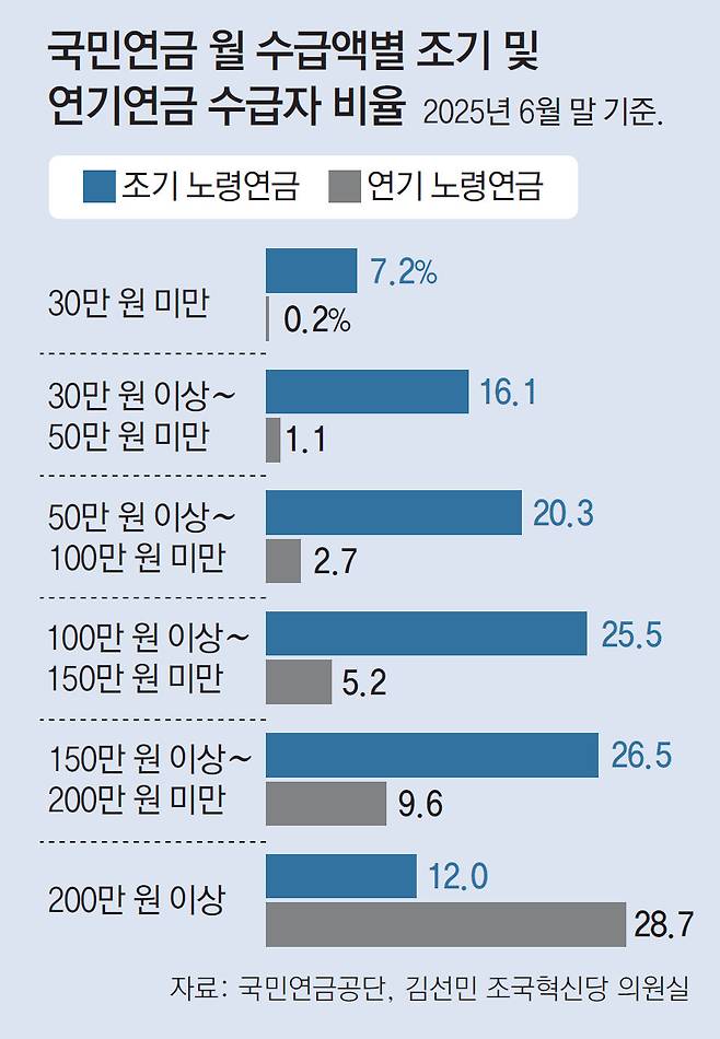 김규동 보험연구원 연구위원은 “국민연금을 5년 앞당겨 받으면 실질적으론 35%가량 월 수급액이 줄어든다”고 분석했다. 조기 수급자 76%는 월 수급액이 100만 원 미만이다. 감액된 금액을 사망 때까지 받게 돼 국민연금의 노후 소득 보장 기능이 약화될 수 있다고 우려하는 이유다.