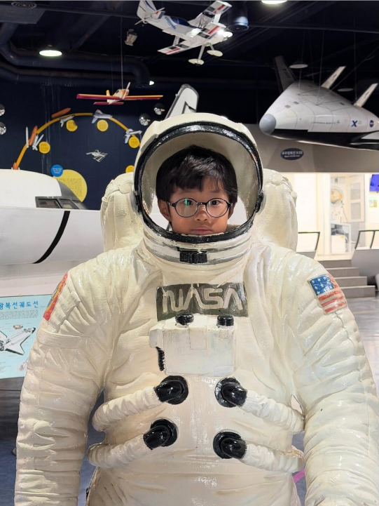 5일 공개된 사진 속 정윤 군은 우주복을 입고 진지한 표정으로 서 있다. 고글 너머로 비치는 맑은 눈빛은 ‘이제 내가 여동생을 지켜줄게’라는 듯, 갓 태어난 동생을 향한 자부심이 가득하다.