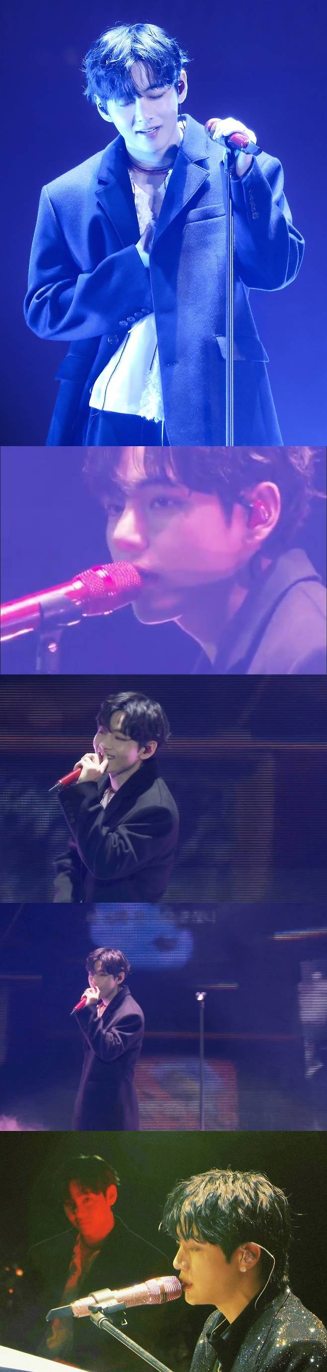 방탄소년단 뷔의 무대는 화려한 퍼포먼스 없이 오직 보컬과 아우라로 완성됐다. 특유의 저음과 호흡, 그리고 절제된 감정이 더해져 무대를 압도했다. 마지막 소절을 부를 때 살짝 눈가가 젖은 모습이 포착되며 관객들의 마음을 울렸다.