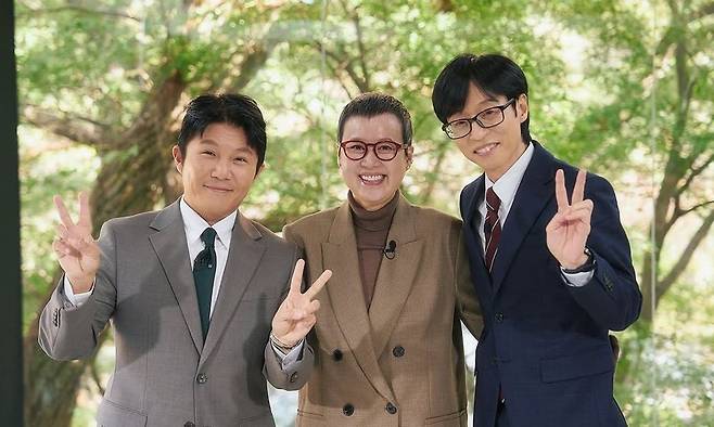 공개된 사진 속 박미선은 짧은 기장의 머리로 유재석, 조세호와 환하게 미소를 짓고 있는 모습이다.