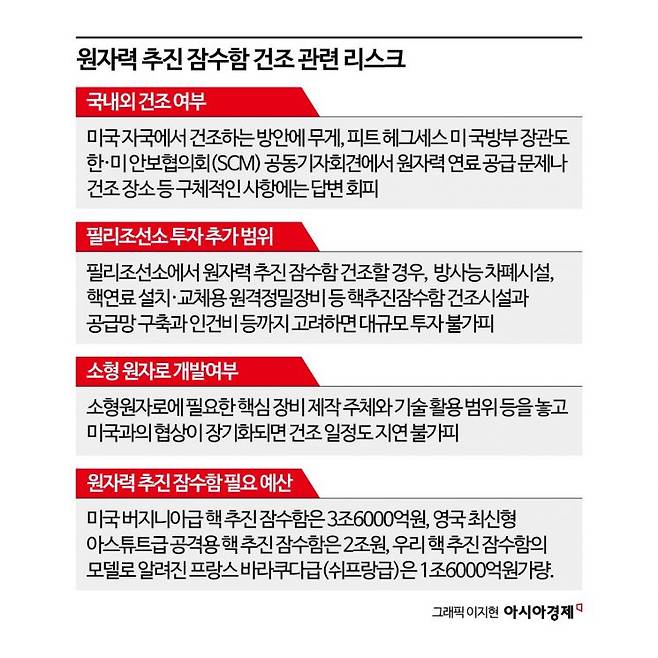 원자력 추진 잠수함을 건조하려면 방사능 차폐시설과 보안·안전시설, 핵연료 설치·교체용 원격 정밀장비 등을 갖춰야 한다. 군함 건조 투자보다 더 큰 비용이 필요하다. 공급망 구축과 인건비 등까지 고려하면 비용 규모는 더 늘어난다.
