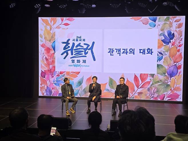 | ▲ 질문에 답하고 있는 장영주 감독 그는 "어디든 틀 수 있는 공간만 있으면, 언제든 이 영화를 보여주겠다"고 말했다. 왼쪽부터 김성재, 장영주, 김승필 |