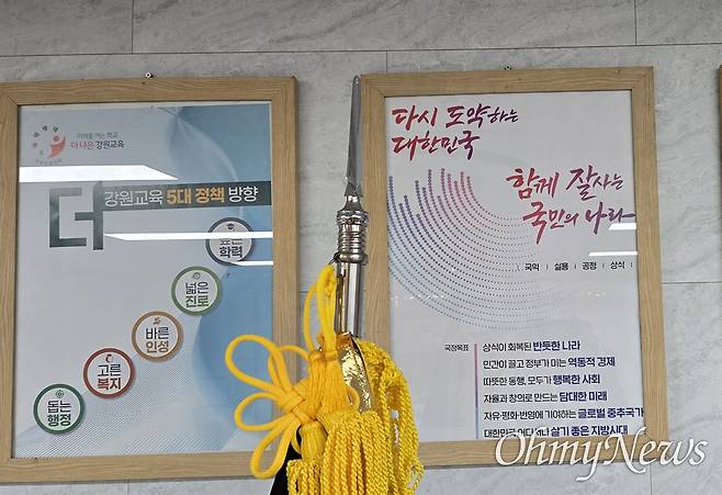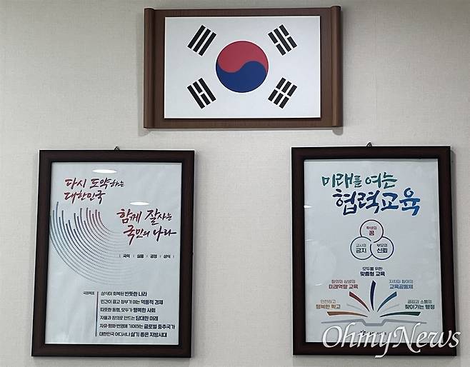 6일, <오마이뉴스>는 강원 지역 A학교 교장실 사진을 살펴봤다. 이 교장실에는 '다시 도약하는 대한민국, 함께 잘사는 국민의 나라. 국익, 실용, 공정, 상식'이란 글귀가 적힌 액자가 걸려 있다. 윤석열 정부가 2022년 7월 26일에 확정한 '국정목표'가 그대로 걸려 있는 것이다.