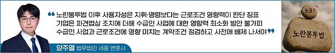 따라서 기업 입장에서는 결국 파견법상 조치에 더하여 앞으로 도급을 함에 있어서 ‘수급인 사업에 대한 영향력’ 자체를 최소화하거나 배제하는 방향으로 운영할 수밖에 없다, 물론 그 구체적인 수준을 어느 정도까지 개선해야 할 것인지는 추후 여러 분쟁에 따른 법원의 판단을 기다려 보아야 할 것이나, 적어도 앞으로 도급을 운영함에 있어서는 단순히 도급인의 지시권 범위를 한정하여 행사하는 것만으로는 부족하고, 수급인 사업의 도급인에 대한 종속 여부 및 그 정도, 수급인 사업과 근로조건 결정 과정에 영향을 미칠 수 있는 계약 조건 등을 점검하고, 그를 통해 수급인 근로자의 근로조건에 영향을 미칠 수 있는 다양한 요소들을 사전에 배제하는 방향으로 도급을 운영해야 한다. 만약 이를 사전에 충분히 고려하지 않는다면, 결국 기업 입장에서는 수급인 근로자들로 구성된 노동조합과의 다양한 노조법상의 의무 이행 및 분쟁을 감내할 수밖에 없다.