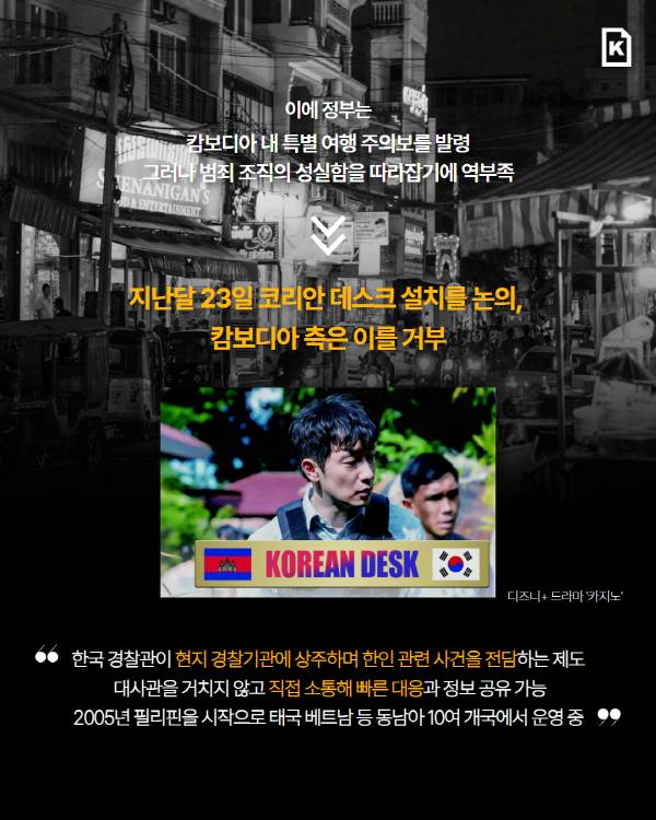 정부는 캄보디아 내 특별 여행 주의보를 발령하며 대응에 나섰다. 그러나 이런 조처가 범죄 조직의 ‘성실함’을 따라잡기에 역부족이라는 지적이 나온다. 현지 주요 범죄 조직은 이미 국경 지대나 인접 국가로 도주했다. 또 우리 경찰은 지난달 23일 현지 경찰과 회담하고 코리안 데스크 설치를 논의했지만, 캄보디아 측은 이를 거부했다. 코리안 데스크는 한국 경찰관이 현지 경찰기관에 상주하며 한인 관련 사건을 전담하는 제도다. 대사관을 거치지 않고 직접 소통해 빠른 대응과 정보 공유를 할 수 있다. 2005년 필리핀을 시작으로 태국 베트남 등 동남아 10여 개국에서 운영하고 있다.