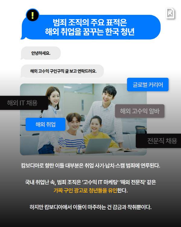 국내 취업난이 심각해 해외에서 기회를 찾으려는 청년이 많아졌고, 범죄 조직은 '고수익 IT 마케팅' '해외 전문직' 등 가짜 구인 광고로 이들을 유인한다.