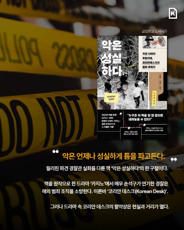 “악은 언제나 성실하게 틈을 파고든다.” 필리핀 파견 경찰관 실화를 다룬 책 ‘악은 성실하다’의 한 구절이다. 책을 원작으로 한 드라마 ‘카지노’에서 배우 손석구가 연기한 경찰은 해외 범죄 조직을 소탕한다. 이른바 ‘코리안 데스크(Korean Desk)’. 그러나 드라마 속 코리안 데스크의 활약상은 현실과 거리가 멀다.