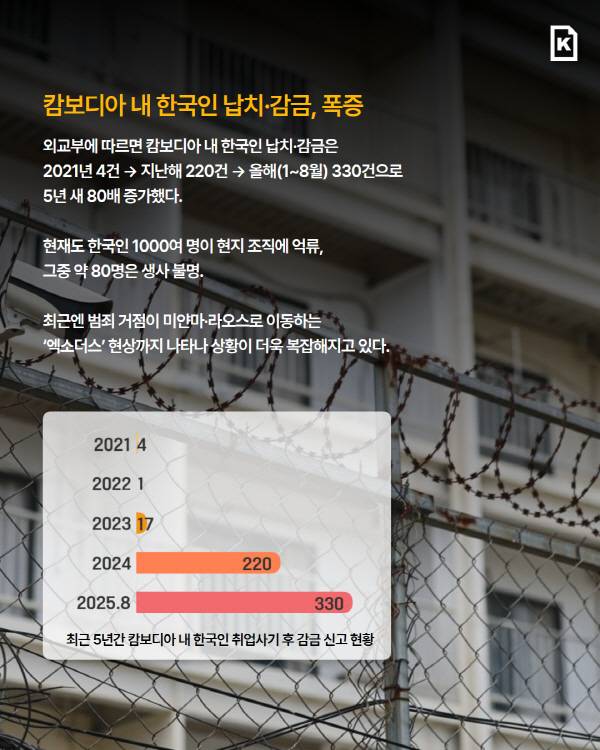 캄보디아에서의 한국인 대상 범죄 심각성은 통계로 드러난다. 외교부 집계 결과 캄보디아 내 한국인 납치·감금 신고는 2021년 4건에서 지난해 220건, 올해 1~8월 330건으로 급증했다. 최근 5년간 무려 80배 폭증했다. 지금도 현지 범죄 조직에 한국인 1000여 명이 억류된 것으로 알려졌다. 이들 중 약 80명은 생사조차 확인되지 않는다. 최근에는 범죄 조직 근거지가 미얀마 라오스 등 인접 국가로 이동하는 ‘엑소더스’까지 벌어져 상황이 한층 복잡해졌다.