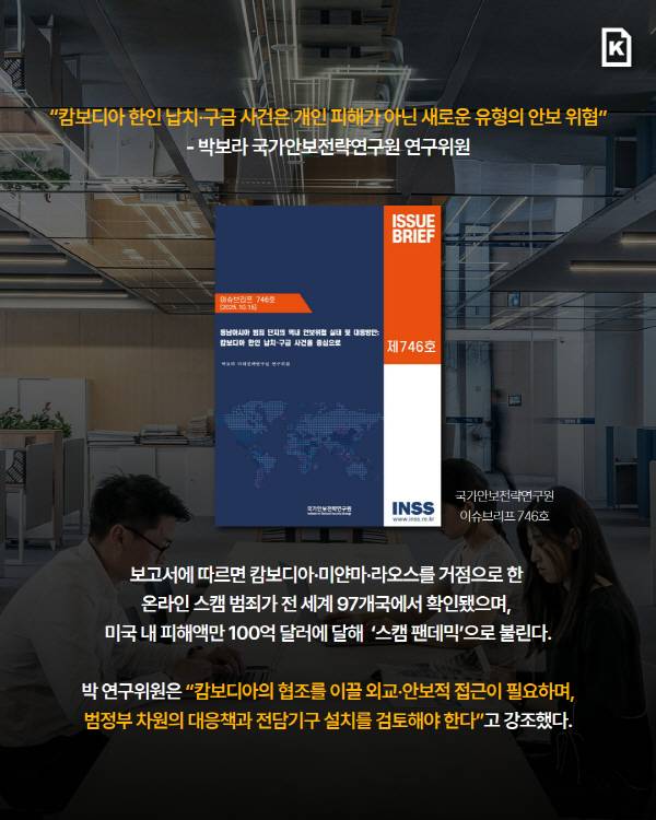 전문가들은 캄보디아 내 한인 상대 범죄가 개인 차원을 넘어섰다고 경고한다. 박보라 국가안보전략연구원 미래전략연구실 연구위원은 최근 ‘동남아시아 범죄 단지의 역내 안보 위협 실태 및 대응 방안 : 캄보디아 한인 납치·구금 사건을 중심으로’ 보고서에서 “캄보디아 문제는 피해자 개인을 노린 단일 사건이 아닌, 새로운 유형의 안보 위협”이라고 진단했다. 보고서가 인용한 미국 평화연구소(USIP) 자료를 보면, 캄보디아 미얀마 라오스 3개국을 거점으로 하는 온라인 스캠 범죄가 전 세계 97개국에서 확인됐다. 미국은 누적 피해액이 100억 달러에 이른다. ‘스캠 팬데믹’이라고 부를 만하다.