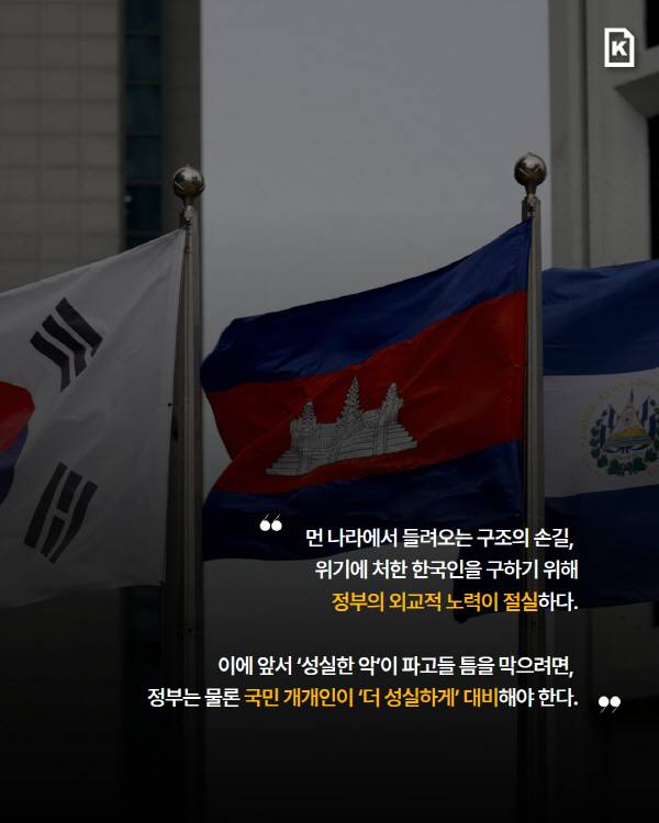 박 연구위원은 실효적 대응을 주문했다. 그는 “국제 형사 공조의 특성상 캄보디아 측의 적극적 협조를 끌어낼 외교·안보적 접근이 필요하다”며 “이를 위해 범정부 차원의 온라인 스캠 방지 대응책 수립과 전담 기구 설치를 검토해야 한다”고 강조했다. 먼 나라에서 위기에 빠진 한국인을 구하기 위해 정부의 외교적 노력이 절실하다. 이에 앞서 ‘성실한 악’이 파고들 틈을 막으려면, 정부는 물론 국민 개개인이 ‘더 성실하게’ 대비해야 한다.