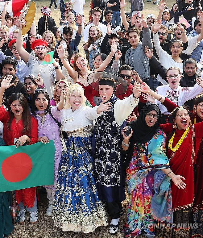 (수원=연합뉴스) 홍기원 기자 = 6일 경기도 수원시 아주대학교에서 열린 '아주 인터내셔널 데이' 행사에서 전통의상을 입은 외국인 유학생들이 함께 모여 사진을 찍으며 즐거워하고 있다. 2025.11.6