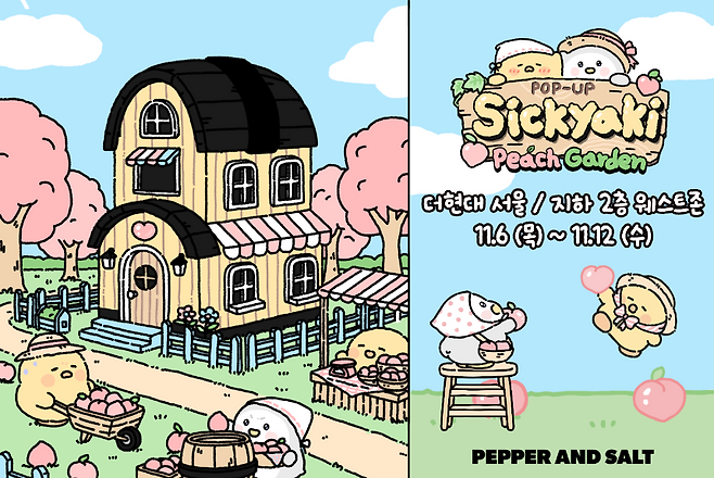 ㈜페퍼앤솔트가 인기 디지털 크리에이터 '병약이(sick_yaki)'와 손잡고 오는 6일부터 12일까지 서울 여의도 더현대서울(WEST 2층) 에서 팝업스토어 'Sickyaki Peach Garden'을 연다고 밝혔다.