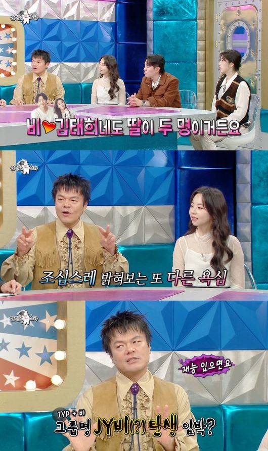 그러면서 박진영은 비와 김태희의 자녀들에 대해서도 언급했다. 박진영은 비, 김태희 부부의 두 딸에 대해 “나중에 잘 키워서 (우리 딸들과) 4명 확보해놓고, 걸그룹을 만들고 싶다”라고 말했다. 비와 김태희의 두 딸 역시 가수이자 배우인 부모를 둔 만큼 확실한 ‘연예인 DNA’임을 간접 인증한 셈이었다.