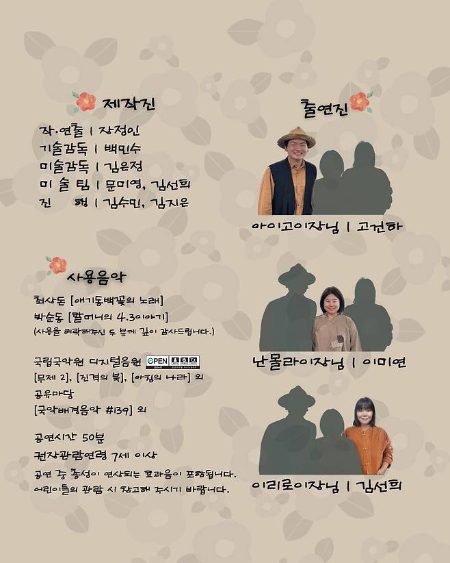 제주의 세 마을을 배경으로 한 이번 작품은 장정인이 대본과 연출을 맡았고 김선희, 고건하, 이미연 배우가 각각 세 이장님을 연기한다. 미술감독 김은정, 기술감독 백민수 등이다. 제작 및 진행 스태프로 문미영, 김지은, 김수민이 작품 초연에 힘을 보탰다.