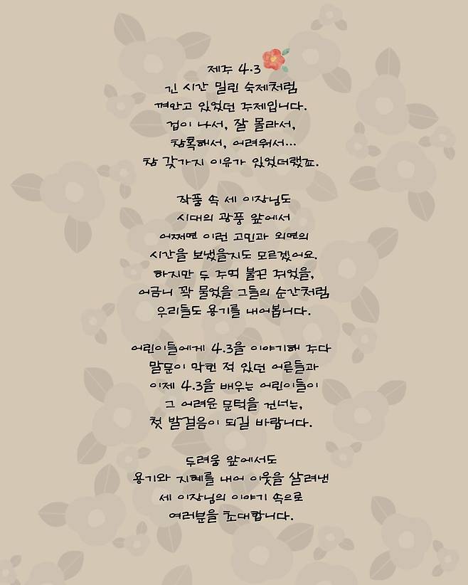 비극적인 사건과 그 후 우리 공동체를 재건하기 위해 노력한 제주 사람들의 이야기를 통해 어린이들과 함께 배울 수 있는 점이 어떤 것인지에 중점을 뒀다고 강조했다.