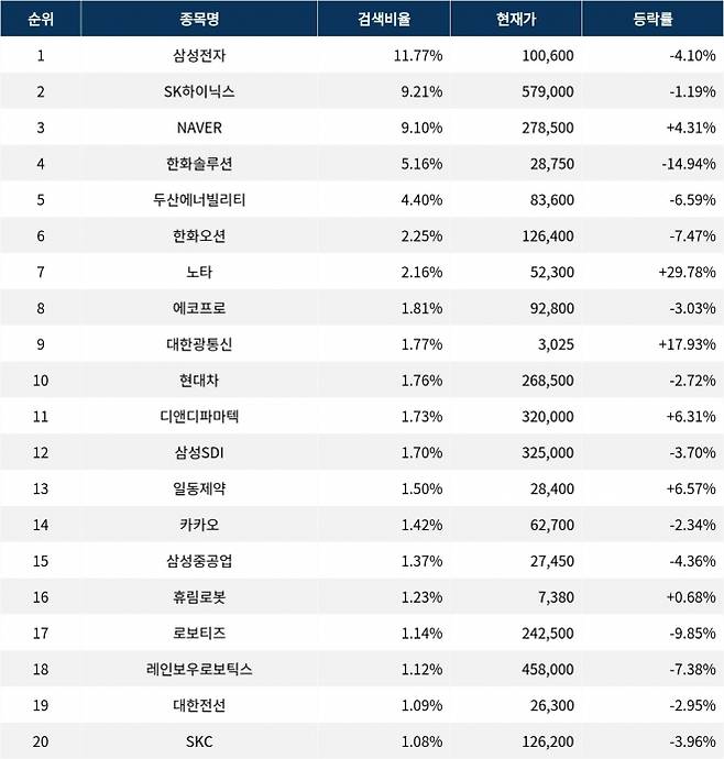 이어 검색비율 2위의 SK하이닉스(000660)는 하락률 1.19%로 하락 마감했다. 검색비율 3위의 NAVER(035420)는 4.31% 상승 마감했다. 검색비율 4위 한화솔루션(009830)은 하락률 14.94%로 큰 낙폭을 보였다. 검색비율 5위 두산에너빌리티(034020)는 6.59% 하락했다.