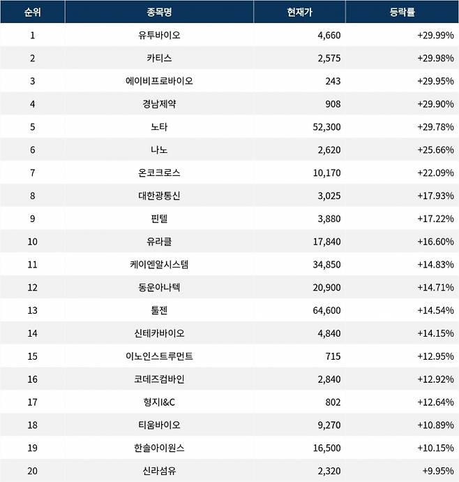 6위 나노(187790)는 종가 2,620원으로 25.66% 급등 마감했다. 7위 온코크로스(382150)는 종가 10,170원으로 22.09% 급등 마감했다. 8위 대한광통신(010170)은 종가 3,025원으로 17.93% 급등 마감했다. 9위 핀텔(291810)은 종가 3,880원으로 17.22% 급등 마감했다. 10위 유라클(088340)은 종가 17,840원으로 16.60% 급등 마감했다.