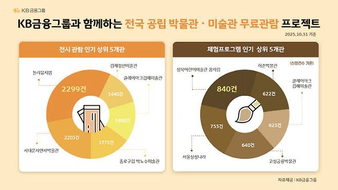 6일 금융권에 따르면 KB금융은 전국 주요 공립 박물관과 미술관 총 45곳을 대상으로 전국민 누구나 전시·관람 또는 체험 프로그램을 이용할 수 있는 KB 무료관람 프로젝트를 진행하고 있다. 이번 인기 순위는 지난 9월 17일부터 10월 31일까지 약 2개월간의 이용 데이터를 분석·산출한 결과다.