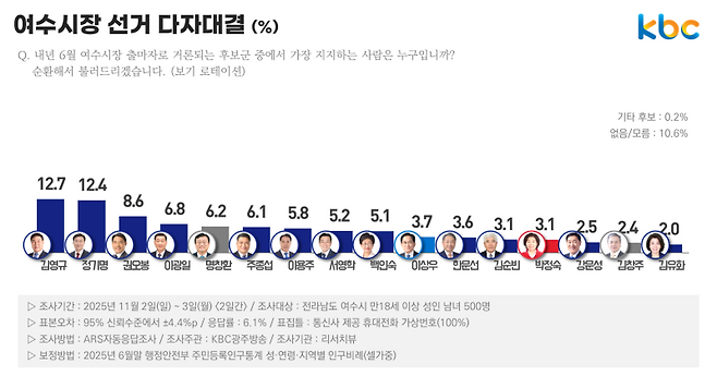 하위권에는 이상우 조국혁신당 여수시 지역위원장 3.7%, 한문선 여수상의 회장 3.6%, 김순빈 전 여수시의회 부의장 3.1%, 박정숙 국민의힘 여수시당협위원장 3.1%, 강문성 전남도의원 2.5%, 김창주 전 여수경영인협회회장 2.4%, 김유화 전 여수시도시관리공단 이사장 2.0% 등이다.