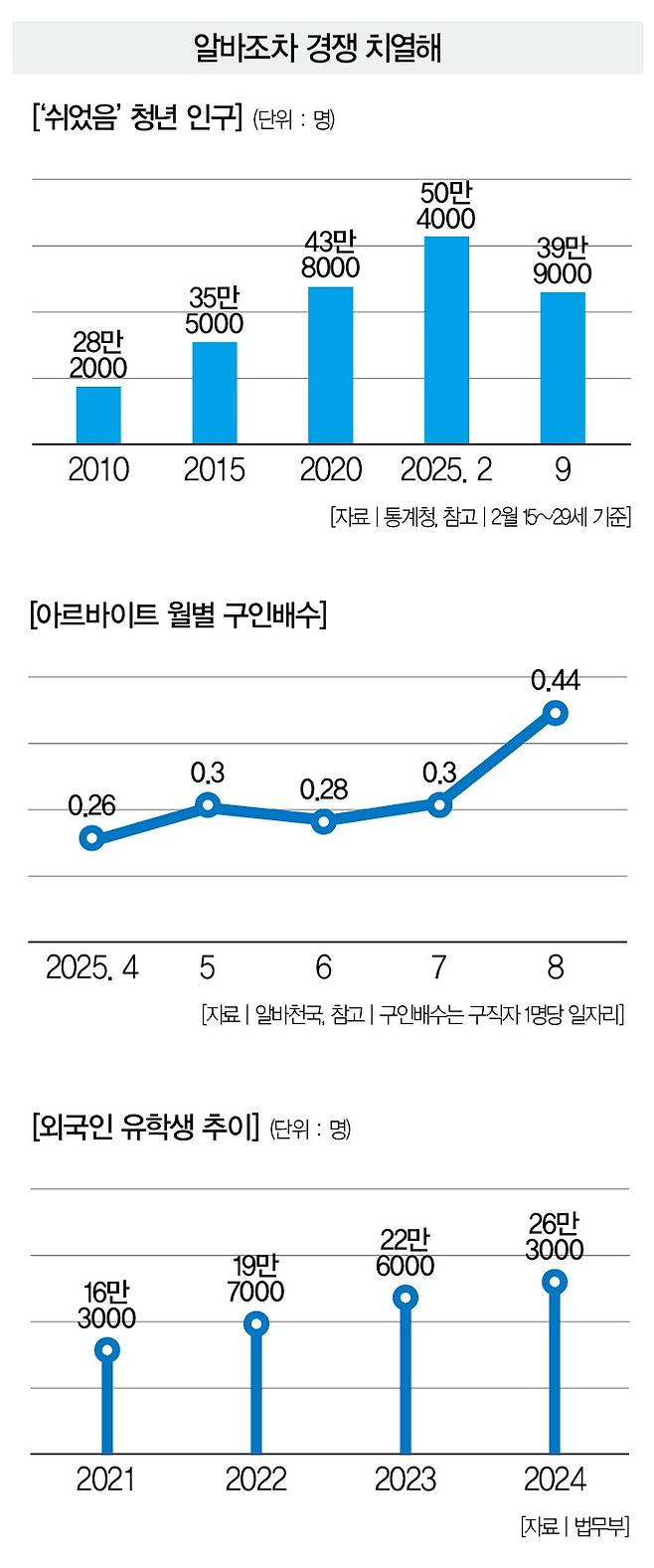 일할 곳이 없는 청년들은 카페‧음식점 등 아르바이트를 전전한다. 알바생을 뽑는 곳이 늘어났지만(월별 구인배수 4월 0.26→8월 0.44·구직자 1명당 일자리), 좁은 문을 뚫어야 한다. '알바 자리'를 놓고 외국인 유학생과 경쟁해야 해서다.