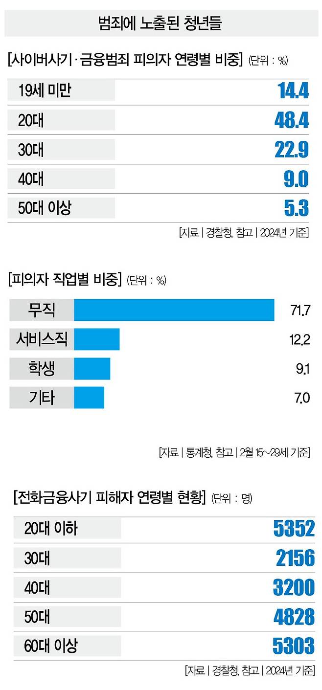 그래서일까. 각종 범죄에 얽히는 청년들이 최근 들어 부쩍 늘어났다. 경찰청에 2024년 조사에 따르면, 보이스피싱이나 대포통장 사업 같은 사이버사기‧금융범죄의 피의자 중 20대가 전체의 48.4%를 차지했다. 30대도 22.9%에 달했다. 통계청이 지난 2월 발표한 '15~29세 피의자 직업별 비중'에선 '무직'이 71.7%로 압도적으로 많았다. 범죄에 빠지는 '쉬었음 청년'이 늘고 있다는 증거들이다.
