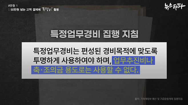 무엇보다 유 위원의 이 같은 ‘쪼개기’ 패턴은 정부가 정한 예산 집행 지침을 어긴 것이다. 기획재정부의 ‘예산 및 기금운용계획 집행지침’은 “업무추진비 등 다른 비목으로 집행이 가능한 경비는 특정업무경비로 집행하는 것을 지양하라”라고 규정하고 있다. 업추비로 집행 가능한 내부 회의나 간담회 비용은 특경비로 쓰지 말라는 뜻이다.