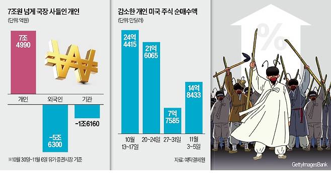개인투자자들이 국장(국내 증시)에 본격적으로 뛰어들고 있다. 최근 1주일 새 유가증권시장에서 7조5000억원어치 주식을 쓸어 담은 것으로 나타났다. 반면 미국 주식 매수 열기는 한풀 꺾인 것으로 파악됐다.