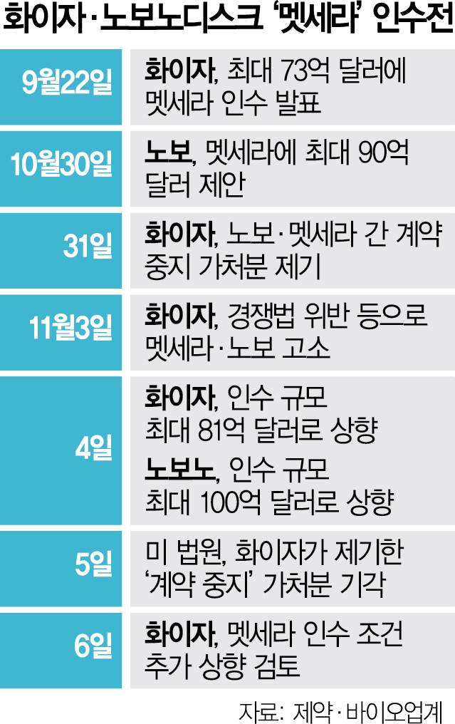 화이자는 올 9월 멧세라와 최대 73억 달러 규모의 인수 계약을 체결한다고 밝혔다. 하지만 10월 노보노디스크가 최대 90억 달러에 화이자와 거래를 종료하는 대가로 해지 수수료도 지불한다고 멧세라에 제안하자 판이 뒤바뀌었다. 화이자는 멧세라 이사회와 노보노디스크가 화이자와의 계약을 부당하게 파기했다며 합병 추진을 중단해달라고 가처분 소송을 제기했으나 델라웨어 법원은 5일 "멧세라 주주에게 더 나은 조건을 가져올 수 있는 경쟁을 존중해야한다”며 이를 기각했다. 화이자는 멧세라와 노보노디스크가 미국의 경쟁법을 위반했다며 추가 소송도 제기한 상태다.