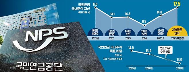 국민연금의 국내 주식 비중은 지난해 말 11.5%에서 올해 8월 14.8%로 높아졌다가 이달 단숨에 17%대로 치솟았다. 삼성전자, SK하이닉스 같은 대형 우량주를 중심으로 전례 없는 강세장이 펼쳐진 결과다.