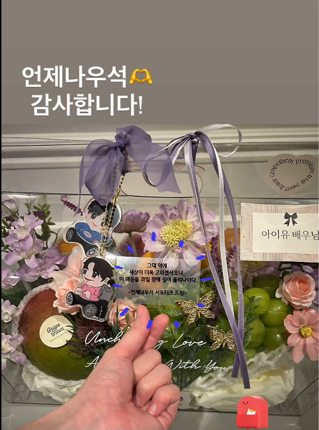 6일 아이유는 자신의 SNS에 “그대 덕에 세상이 더욱 고와졌사오니, 이 마음을 과일 향에 실어 올리나이다”라는 문구와 함께 여러 장의 사진을 게재했다. 배우 변우석의 팬들이 보낸 과일 바구니에 감사 인사를 전하며, 하루 만에 14장의 이미지를 올린 것이다.