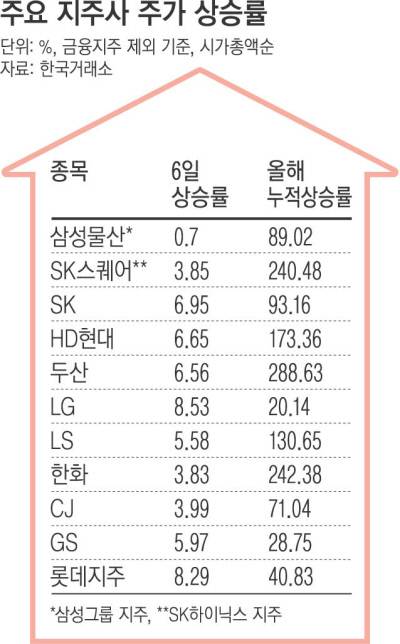 지주사 종목은 ‘저평가’ 주식의 대명사였다. 주가순자산비율(PBR)이 대체로 1배 미만이었다. 올해는 달라진 모습이 보인다. 이날 기준으로 두산(288.63%), 한화(242.38%), SK스퀘어(240.48%·SK하이닉스 지주사), 효성(180.81%), HD현대(173.36%), LS(130.65%)는 올해 주가가 두 배 올랐다. 삼성그룹의 지주사 격인 삼성물산, SK, CJ도 모두 올해 67.8% 오른 코스피의 수익률을 웃돌았다. 두산 우선주(두산우, 두산2우B)의 경우 올해 주가 상승률이 400%를 넘겼다.