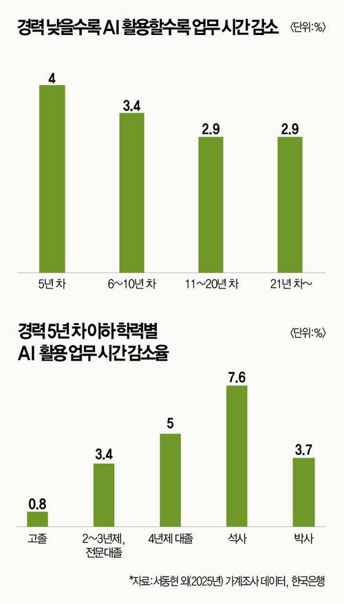 연구팀은 연령대별 고용 영향 차이와 관련, “주니어는 AI로 대체하기 쉬운 정형화되고 교과서적인 지식 업무를, 시니어는 업무 맥락 이해, 대인 관계, 조직 관리 등 AI가 현재로서 대체하기 어려운 암묵적 지식과 사회적 기술이 필요한 업무를 주로 담당하기 때문”이라고 풀이했다.