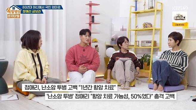 앞서 정애리는 난소암 1기 진단을 받고 항암 치료를 받은 바 있다. 그는 "지금은 좋다. 완치다. 5년 훨씬 지났다. 5년 지나면 암에서 졸업한다고 한다"라며 "자기가 아파보면 알지 않나. (홍)진경 씨와 같은 (난소) 암이었다. 그래서 관심이 있었고 지켜봤던 거 같다. 그때 좋은 습관을 지니려고 노력했다. 더 조심하게 되더라"고 말했다.