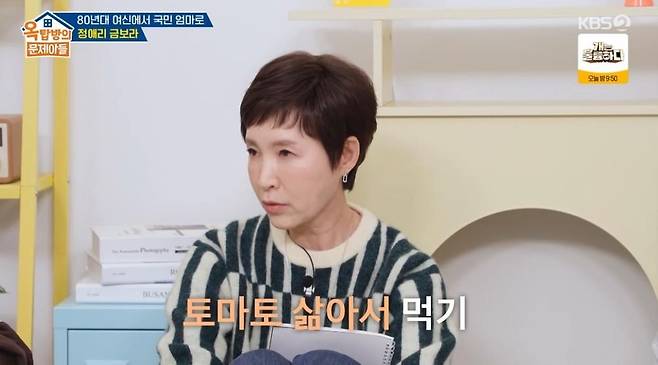 정애리의 건강관리 루틴도 공개됐다. 그는 "아프고 나서 토마토를 삶아서 올리브유를 뿌려서 챙겨 먹는다. 그 밖에는 산책과 요가를 꾸준히 하고 있다"라고 밝혔다.