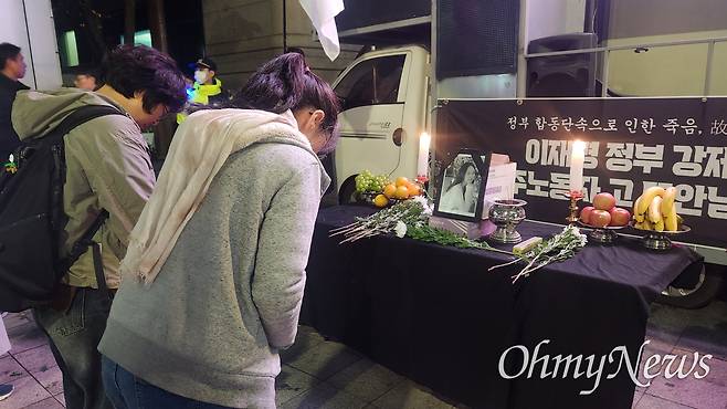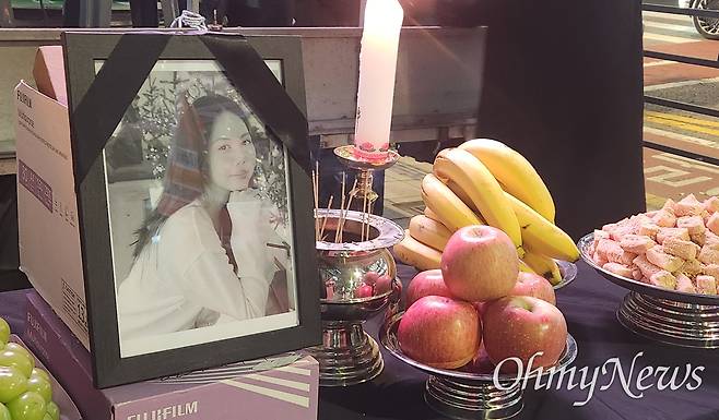 | ▲ 6일 오후 서울 종로구 서울출입국외국인청 세종로출장소 앞에서 '이재명 정부 강제단속 규탄! 故뚜안씨 추모 촛불행진' 현장에서 뚜안씨의 영정사진과 제사상이 놓여있다. 지난달 28일 숨진 베트남 출신 이주노동자 뚜안씨(여, 25). 뚜안씨는 대구 성서 공단에서 정부의 합동단속을 피해 3시간 가량 숨어있던 도중 친구에게 "무섭다", "숨쉬기 힘들다"는 메시지를 보낸 뒤 숨진 채 발견됐다. |