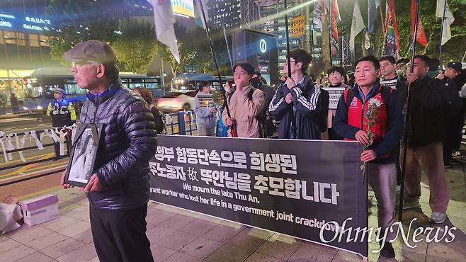 이주노동자차별철폐네트워크 '사람이 왔다'는 이날 오후 7시 서울 종로구 서울출입국외국인청 세종로출장소 앞에서 '이재명 정부 강제단속 규탄! 고 뚜안씨 추모 촛불행진'을 열었다. 지난달 28일 대구 성서공단에서 대구출입국관리소의 단속을 피하려다 추락사한 고인을 추모하는 자리다. 공장 에어컨 실외기 창고 안쪽에 숨어 있다가 추락한 것으로 알려진 뚜안씨는 사망 직전 3시간가량 친구에게 "무서워", "숨쉬기 힘들어" 등 메시지를 보냈다.