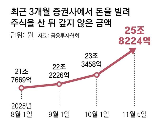 변호사 시험에 합격한 김모 씨(28)도 올 4월 변호사 자격증을 받자마자 은행에서 법조인 마이너스통장을 개설해 마련한 8000만 원을 엔비디아와 테슬라, 아이온큐 등 미국 주식에 6000만 원, 가상자산과 선물에 각각 1000만 원을 투자했다. 이처럼 대출을 받아 주식에 투자하는 2030세대가 늘다 보니 5일 신용거래융자 잔액은 25조8224억 원으로 역대 최고치를 경신했다.