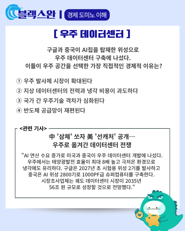 우주공간에 데이터센터를 짓는 ‘우주데이터센터’가 새로운 패권 경쟁 분야로 떠올랐다. 우주항공청은 내년 상반기 핵심 기술 확보를 위한 R&D 사업 기획 연구를 수행하고 2027년 예산을 신청할 방침이다. 구글은 AI칩 TPU를 탑재한 ‘선캐처 프로젝트’를 공개했고 2027년 초 시험용 위성 2기를 발사한다. 중국은 ‘삼체 연산 위성군’ 계획으로 올 5월 위성 12기를 발사했으며 AI 위성 2800기로 1000페타플롭스급 슈퍼컴퓨터를 구축한다는 구상이다. 리서치앤드마케츠는 궤도 데이터센터 시장이 2035년 390억 달러에 이를 것으로 전망했다.