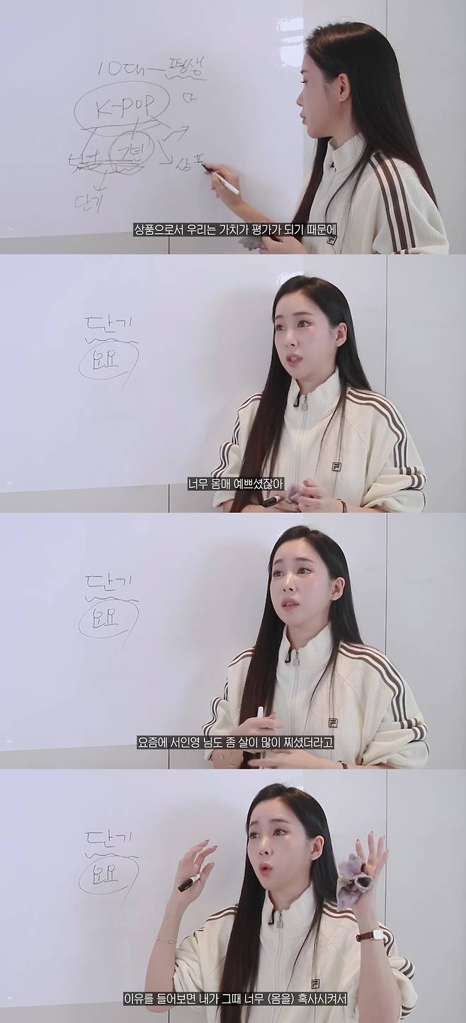 이날 웨이는 "(걸그룹 계약이) 요즘 7년이다. 짧지 않나. 단기다. 상품으로 가치가 평가되기 때문에 짜내는 다이어트를 시킨다"며 "'연예인이 이렇게 뺐다더라'하며 방법이 되어 버린다. 진짜 잘못된 다이어트다. 유명인 따라하면 안 된다"고 강조했다.