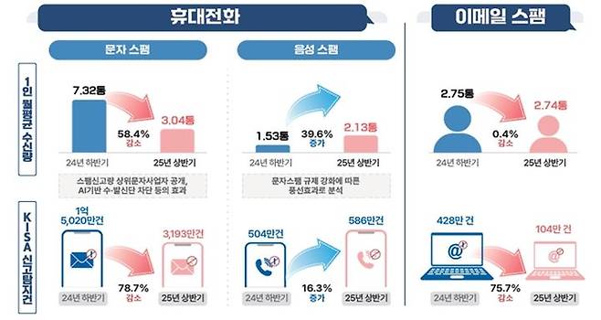 1인당 월평균 문자·음성·이메일 스팸 수신량은 7.91통으로 지난해 하반기(11.6통)보다 3.69통(31.8%) 줄어들었다. 관련 스팸 신고·탐지 건수(3883만건)도 지난해 하반기(1억5952만건) 대비 1억2069만건(75.7%) 감소한 것으로 조사됐다.